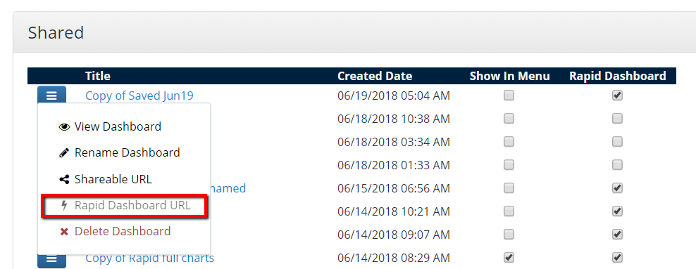 使用快速仪表板URL,选择蓝色行动图标左边的指示板的名字。