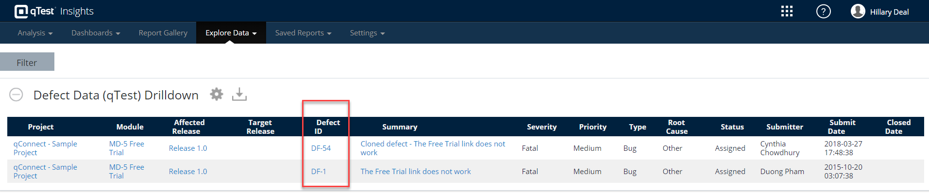 你看到的外部数据的见解包括一个链接连接到外部系统。超链接是可用的缺陷ID和汇总列。