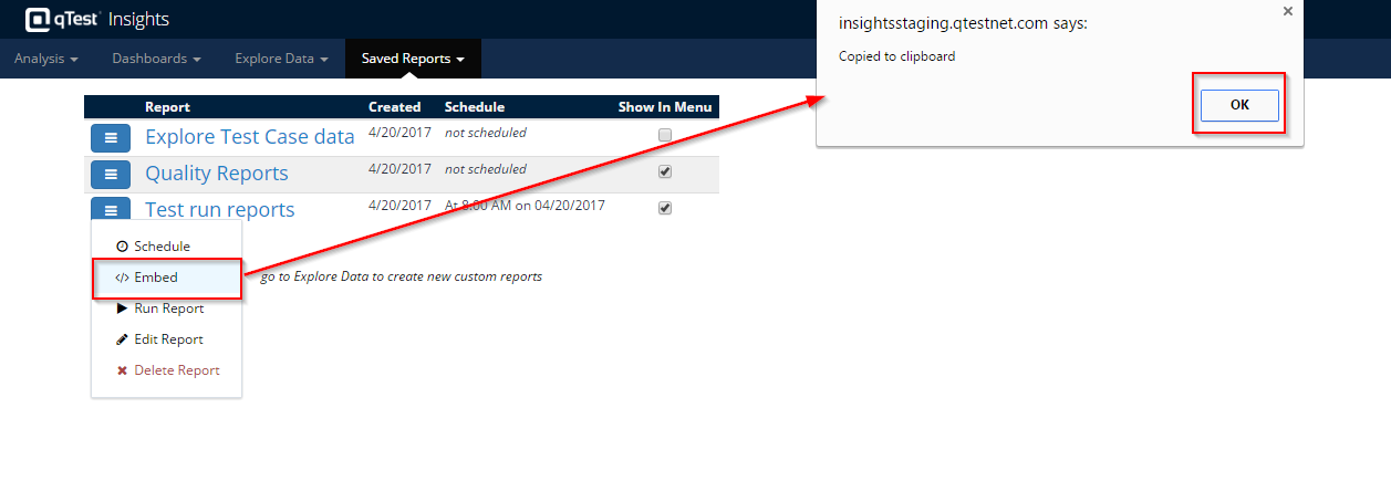 图标快速嵌入脚本复制到剪贴板。报告中列出的保存报告>管理选项卡中嵌入脚本选择当你扩大图标列表