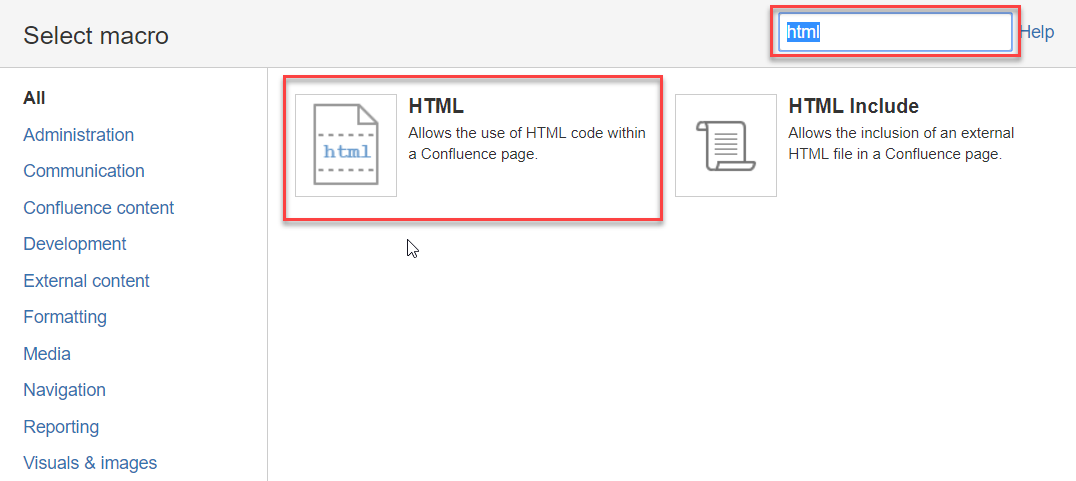 这些指令是融合服务器。下面描述的HTML宏不可用融合云。你需要找到一个HTML的宏Atlassian市场。