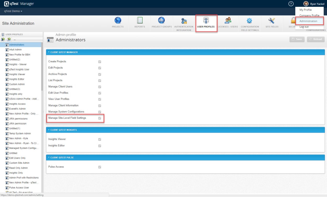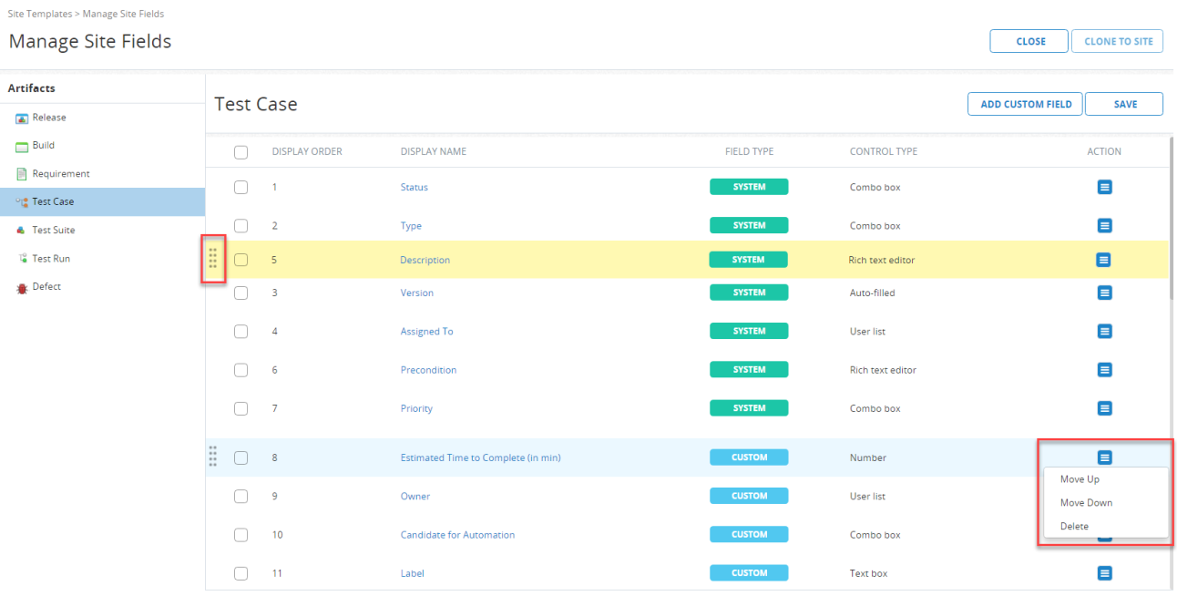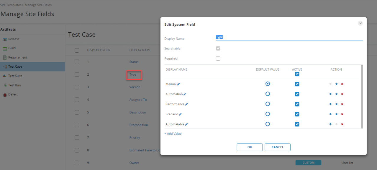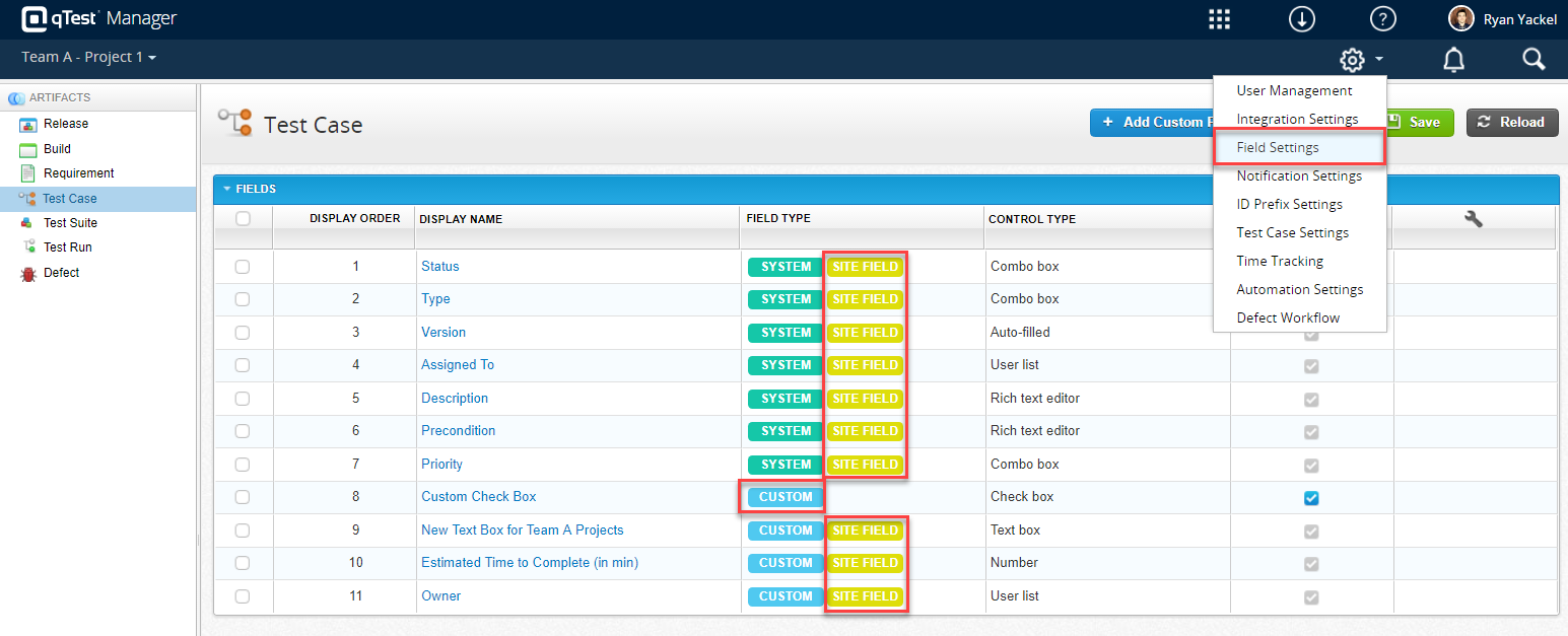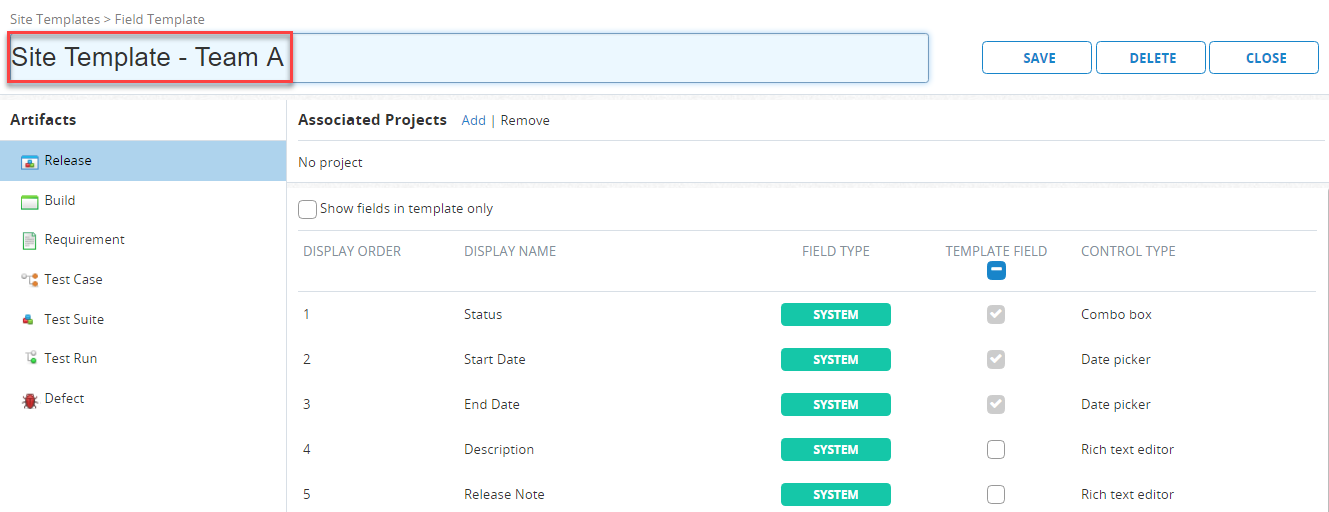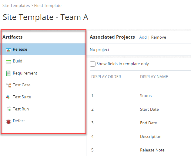 网站管理领域类似于一个项目的页面字段设置。它显示一个列表的字段(系统和自定义字段)为每个工件类型(释放,测试用例等)。使用左侧导航面板开关从一个对象类型到另一个地方。在这个页面中,您可以: