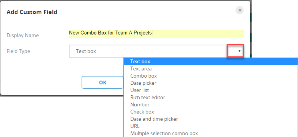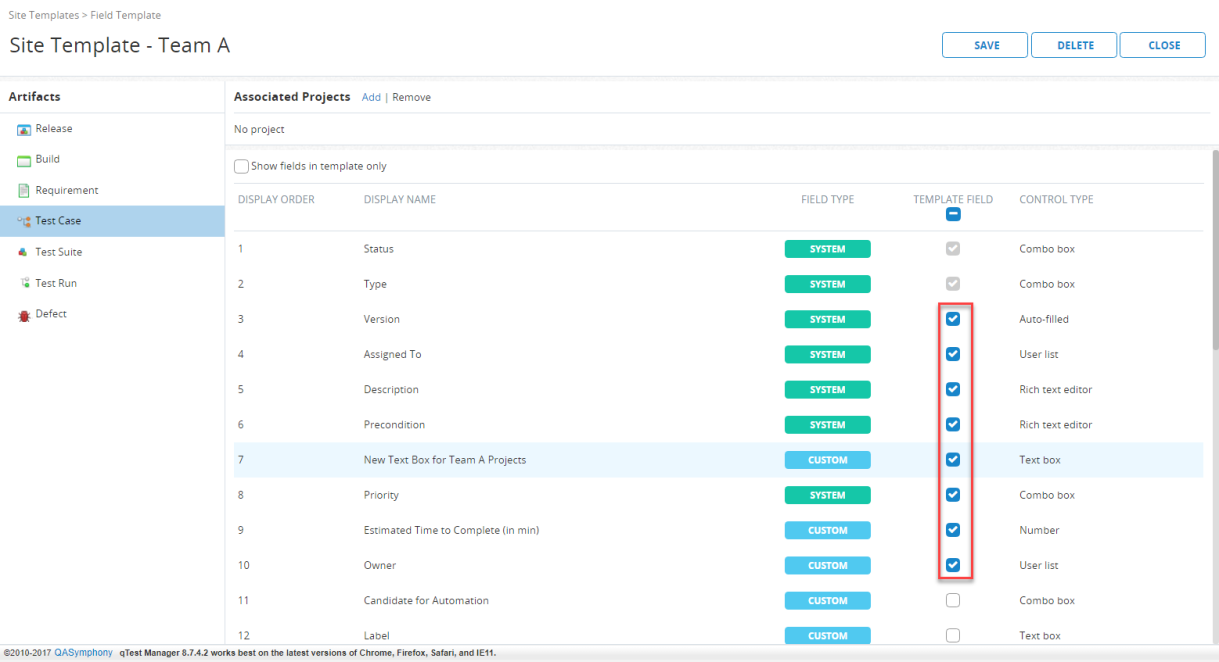 4. 网站领域你的模板,选择的复选框模板字段列。我还创建一个名为“的组合框新文本框为团队项目“我想规范所有项目。请记住,所有模板(测试运行状态)必须包括一些系统生成的网站领域