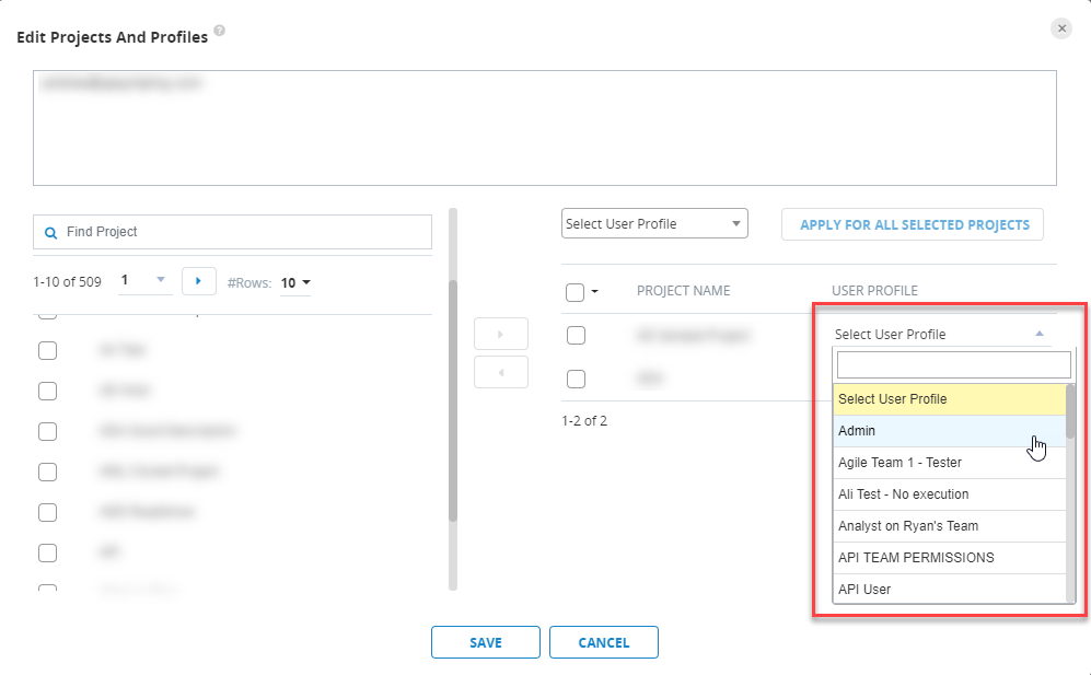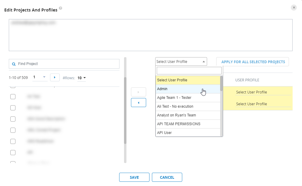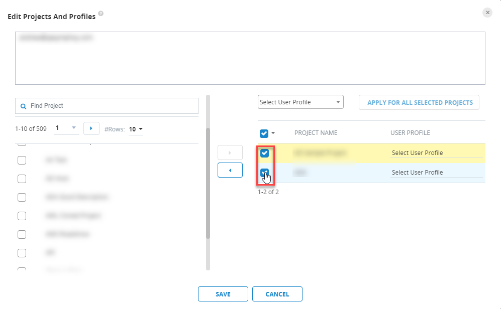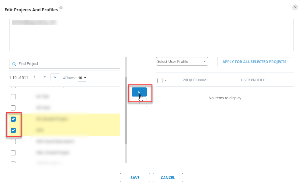 在“编辑项目和概要文件对话框”,选择你想要的项目分配或改变你的用户用户配置文件(s)。为此,选择旁边的复选框(es)项目(s),然后选择右箭头图标。