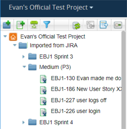 例子:这个例子显示了一个顶级模块进口,名叫Jira嵌套,在该模块三个模块命名为“EBJ1”、“冲刺3”、“介质(P3)”和“EBJ1冲刺4内的。”介质(P3)模块有四个需求。这个项目的JIRA要求组织引进集成设置需求在一个嵌套的结构,它包含冲刺和优先级。