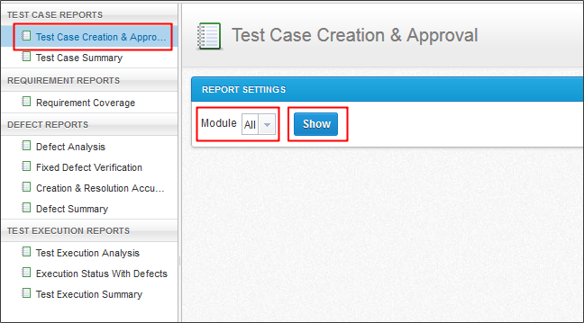 这份报告提供了一个审计测试用例创建并批准,可滤过的模块。你可以选择一个特定的模块报告显示的数据。一次只可以选择一个选项。的“所有”选项用于选择所有模块,默认情况下。