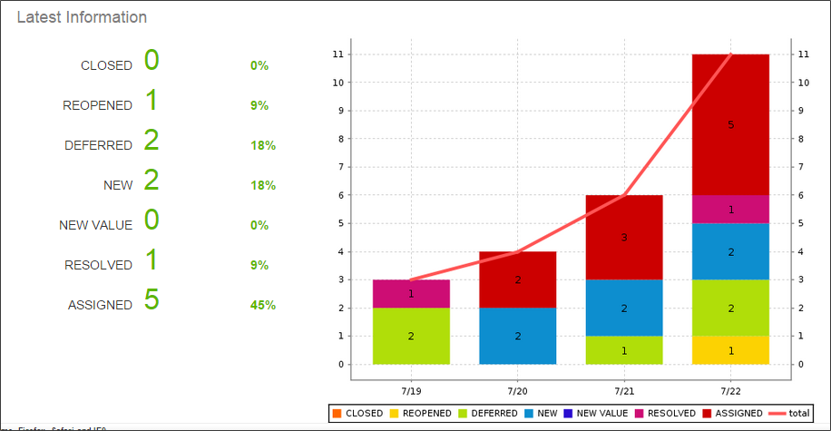 的最新信息部分显示当前的数量和比例缺陷,按之前选定字段分组。所有的这些信息提供了一种快速视图缺陷在系统中。在指定数据过滤标准,你可以选择显示图标查看缺陷数据报告为一个列图表。以下图表,传说基于之前选定字段和值显示出来。