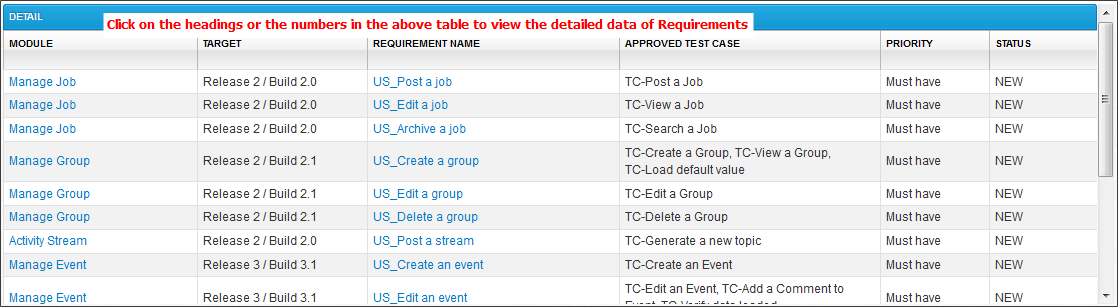 的数据网格包含批准的详细数据测试用例在选定的模块。您可以导出一个网格Excel文件。
