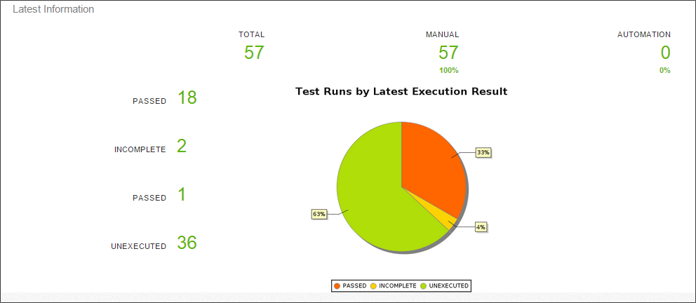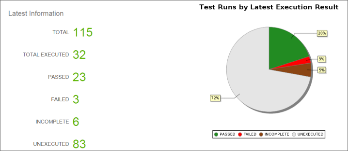 的最新信息部分显示当前的数量测试运行详细的数量测试运行被洛杉矶分组测试执行结果在选定的版本/测试周期/测试套件。