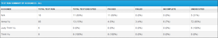 这份报告提供了一个总结测试运行由受托人。该报告可以被释放,过滤测试周期,测试套件和受让人。