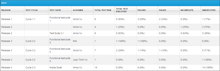 的数据网格包含一个详细的报告测试运行总结,下令释放,测试周期,测试套件和受让人。