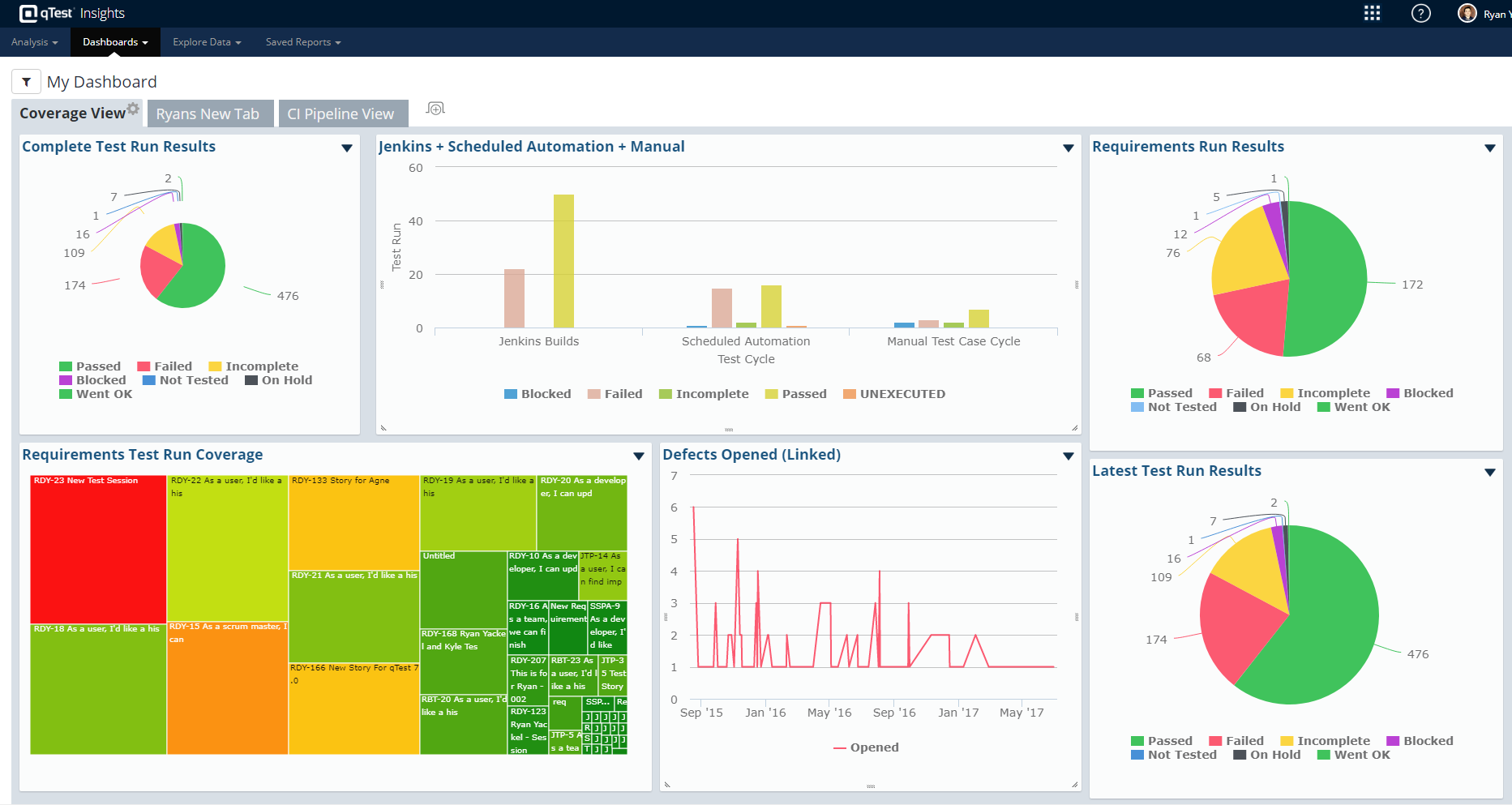 的最新信息部分显示所有测试运行在选定的标准。数据统计和显示饼图。