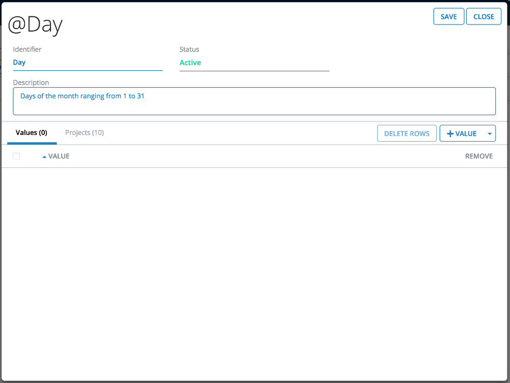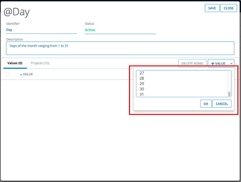 将值添加到参数,选择+价值图标,弹出对话框将显示。