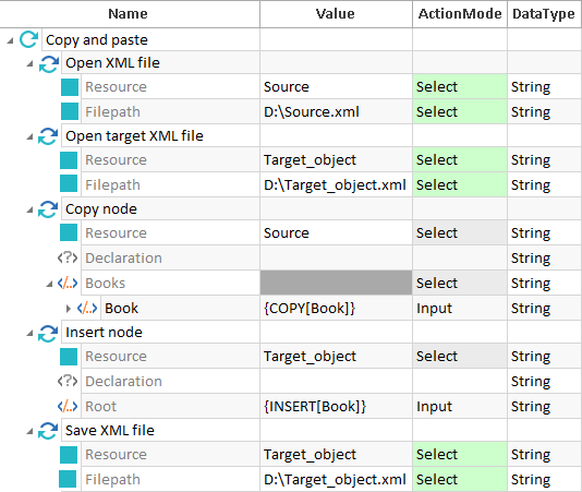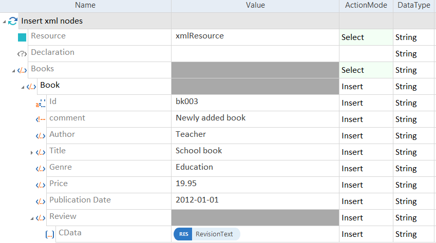 该文件的内容books.xml编辑后加载到资源xmlResource。一本新书添加元素和子元素和值。ActionMode设置插入。 一个CData文本添加到元素审查从加载资源RevisionText。