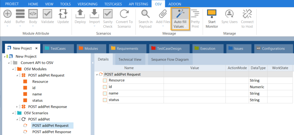 导航到连接OSV场景。相应的XTestSteps包含所有模块属性初始XTestStepValues(空)。