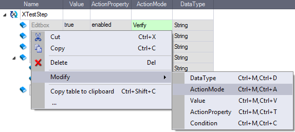 的值ActionMode列可以修改一个或多个TestStepValues通过上下文菜单或动态菜单测试点。这个选项对已经生成的XTestStepValues可用。